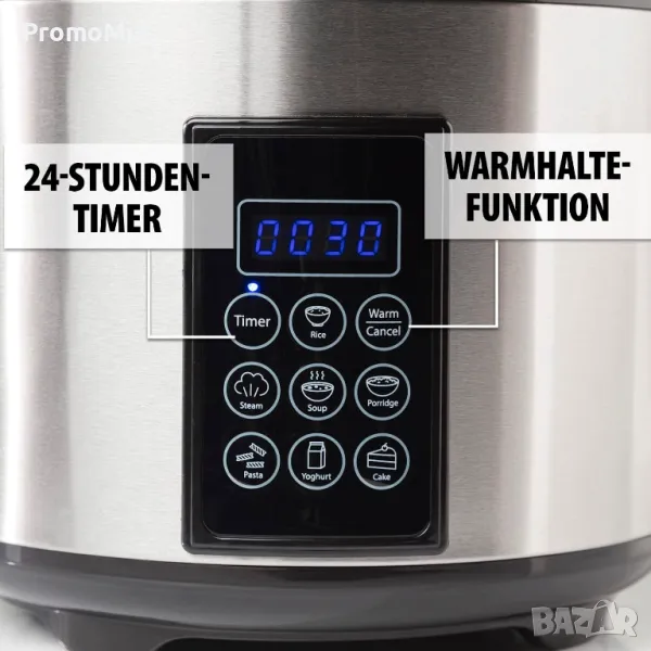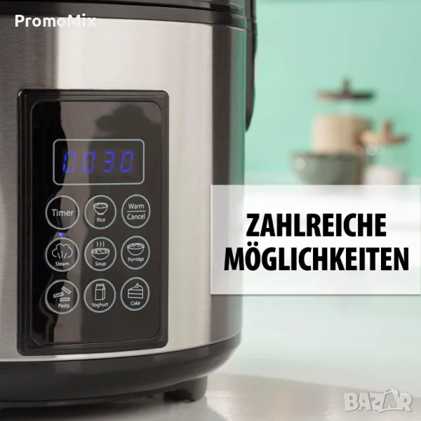 Модела разполага с 7 предварително зададени програми, като готвене на пара, поддържане на храната топла, приготвяне на кисело мляко, паста, супа и др.