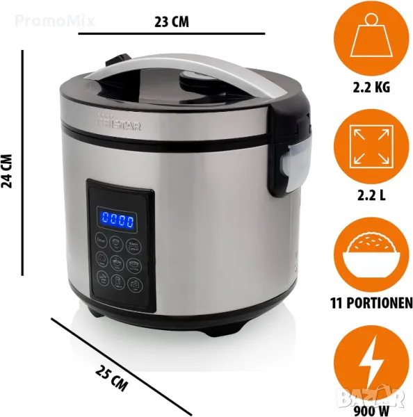 Tristar Steam Cooker RK-6138 е мултикукър с мощност от 900 W и капацитет 2.2 литра, подходящ за приготвяне на ястия за около 8-10 порции.