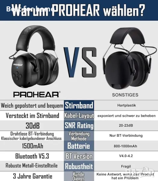 PROHEAR 037 Защита на слуха с Bluetooth, BT 5.3 технология Слушалки с вграден микрофон и намаляване на шума за косене и интензивни дейности в свободното време, SNR 30 dB, NRR25 dB - черни