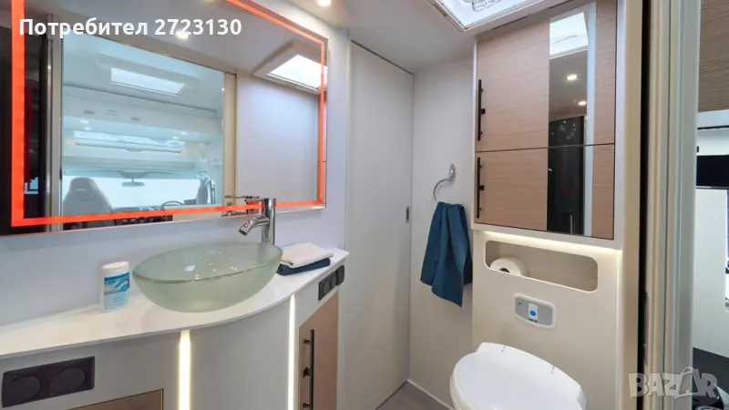 Уникалното в този кемпер е Разделяне на три помещения. Това е изключително удобно, както по време на пътуването, така и когато кемперът се използва от 4 човека. Този начин на организиране на помещенията осигурява комфорт на всички обитатели. Нощна система със синя светлина. Таванен инверторен климатик за топло и студено 2кW