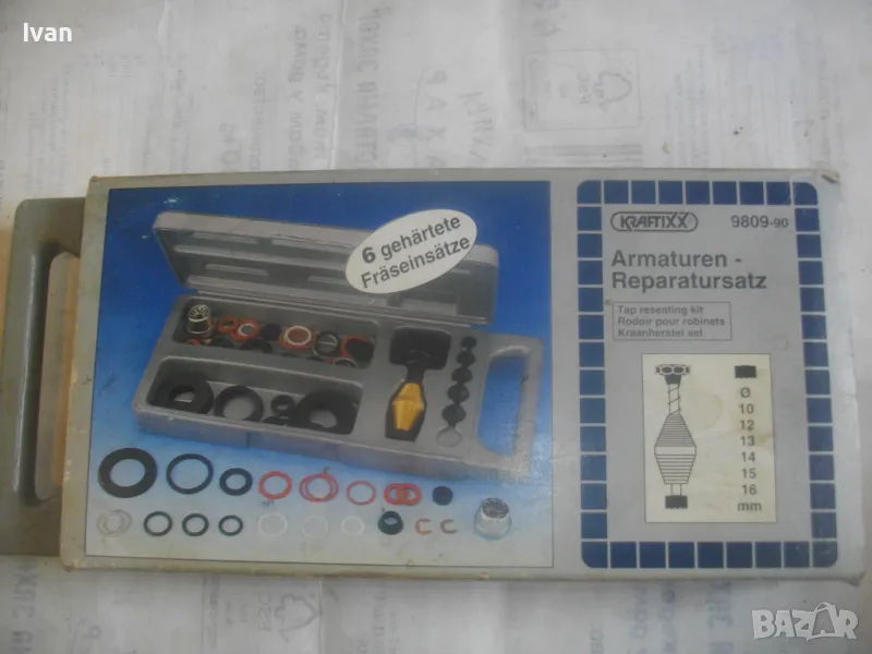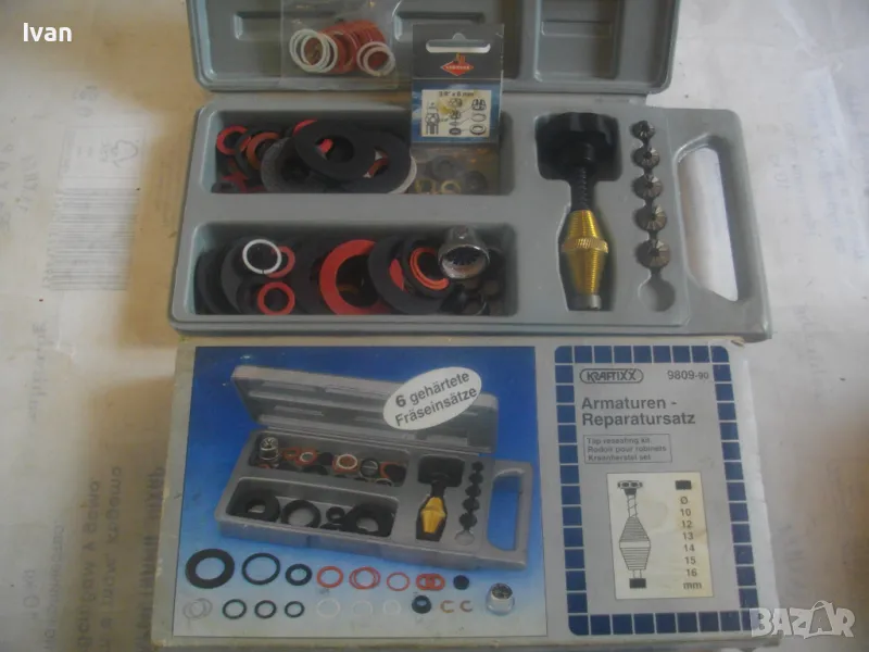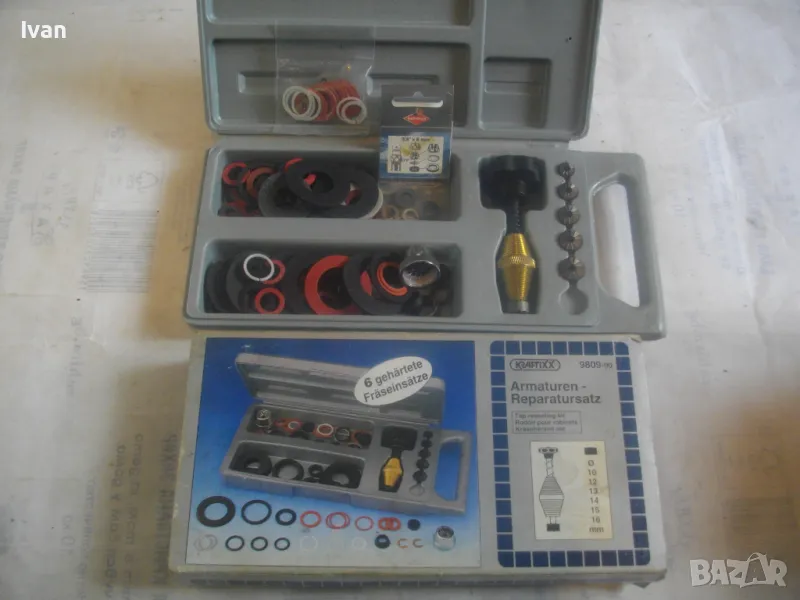 ОПИСАНИЕ на ремонтен комплект за Вик смесители и батерии - 129 лв. Нов, неизползвани неупотрябяван. Немски оригинален. Пълен комплект. Аксесоарите са видни на снимките. Марка и модел на комплекта - KRAXTIXX 9809-90. Размер на екстрактора ф 10 мм, ф 12 мм, ф 13 мм, ф 14 мм, ф 15 мм, ф 16 мм. Около стотина броя различни големи и малки уплътнения. Оригинална немска пластмасова кутия с дръжка и оригинална немска картонена опаковка.
