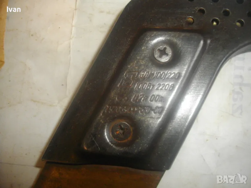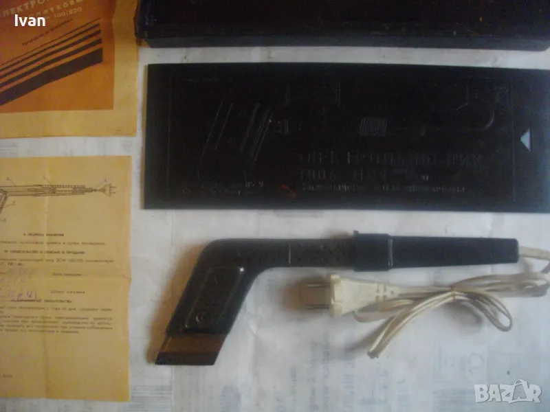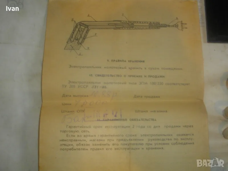 ОПИСАНИЕ на руски/СССР ел.поялник. Малко ползван, почти нов, в отлично техническо/работно състояние. Много запазен външен вид. Изстива много бавно. Масивен, реотанов, с корпус от закалена стомана с прорези. Голяма масивна, плътна медена човка с размери работна част 50 х 30 х 12 мм. Захранване 220 волта, мощност на поялника - 100 вата. Бакелит покритие на дръжката. Оригинален захранващ руск кбел с оригинален щепсел. 2 бр. книжки документи към поялника. Година произовдство - 1988 г. на ММП УССР.