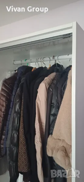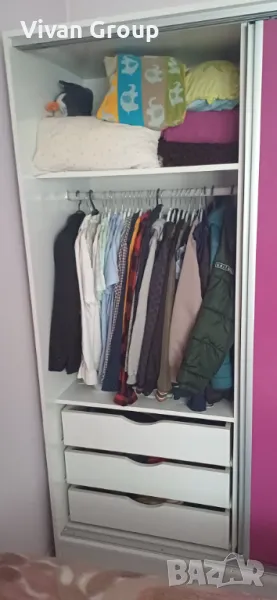 Гардеробът е с три крила и релса за закачалки отляво и отдясно, а по средата е с рафтове.