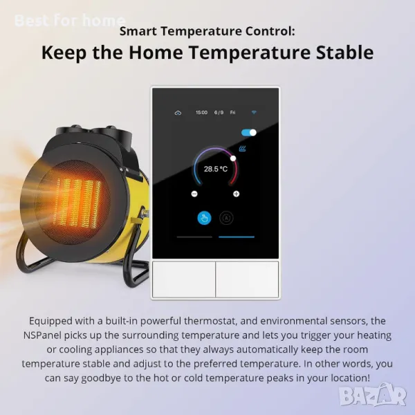 NSPanel Smart Scene Wall Switch е оборудван с вграден мощен термостат и сензори за околната среда. Можете да зададете различни вътрешни температури за различни периоди от време и NSPanel автоматично ще задейства оборудването за отопление или охлаждане според вашите зададени условия, за да поддържа комфортна температура в стаята.