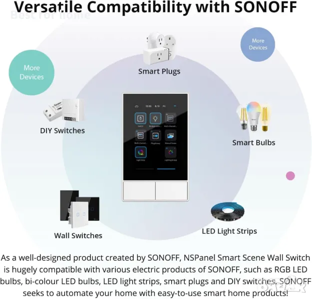 SONOFF NSPanel е съвместим с различни устройства на SONOFF, като интелигентни led крушки, LED крушка с нажежаема жичка, LED светлинни ленти, щепсели S26/S31, TX, MINIR2, POWR3!