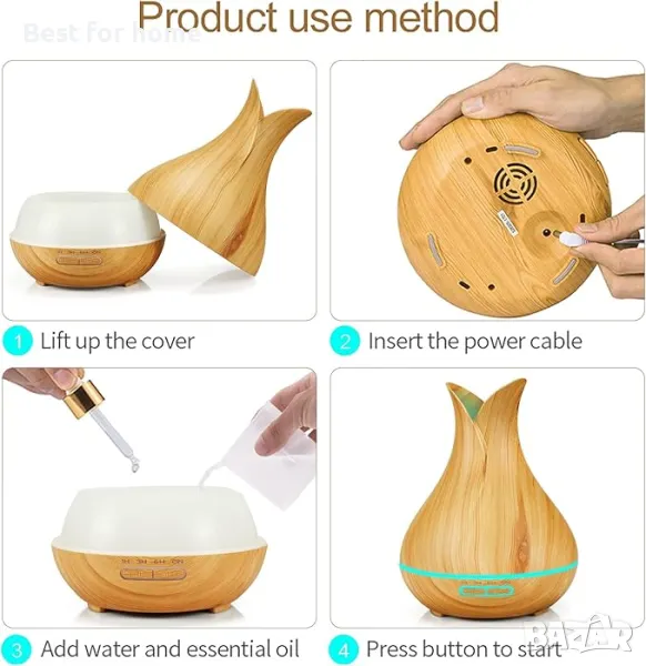 Дифузор за етерични масла: Ултразвуковият ароматен дифузор може ефективно да пречиства въздуха. По време на процеса на пулверизиране, овлажнителят може ефективно да повиши вътрешната влажност, да овлажни сухия въздух, което може ефективно да премахне миризмата на боя, плесен, дим. Просто добавете няколко капки от любимото си етерично масло и ще направите въздуха по-свеж и ще предпазите здравето на вас и вашето семейство.
