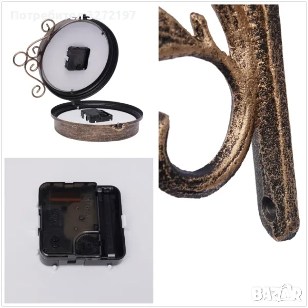 Винтидж двустранен безшумен стенен часовник+стойка за окачване,ковано желязо