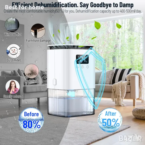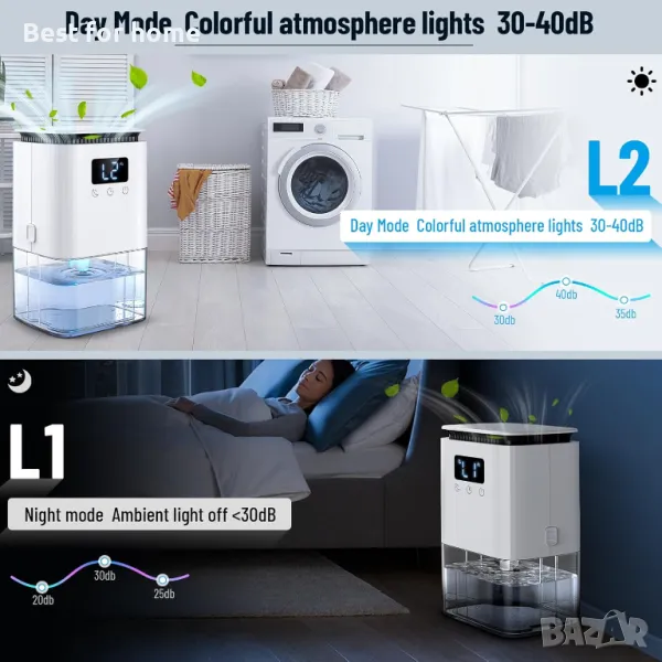 Компактен и лесен за използване: преносим електрически изсушител с практична дръжка за носене ви позволява лесно да го транспортирате до всяко място, за да посрещнете вашите нужди от изсушаване. Идеален за помещения от 15-20 квадратни метра като мазета, спални, всекидневни, бани, шкафове и кемпери. Подвижният контейнер за вода с 360° визуализация позволява лесно почистване и осигурява ясен изглед на ефекта на обезвлажняване.Автоматично размразяване със 7 цвята. Нощна лампа Режим на заспиване Обезвлажнител.