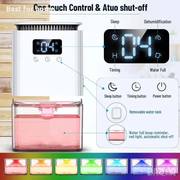 Режим на заспиване и 7-цветна нощна светлина: В режим на заспиване шумът е по-нисък от 35 dB, което не засяга вашата работа, учене или сън. Домът на обезвлажнителя има 7 цвята LED светлини, които могат или да се променят непрекъснато, или да задържат цвят. Те могат да се използват като осветление през нощта, за да създадат романтична и уютна среда за вас. Натиснете продължително бутона за захранване, за да изключите нощната лампа.