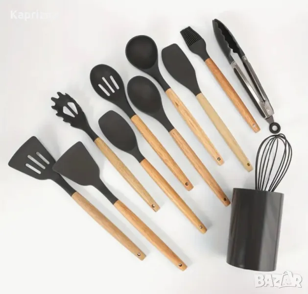 Стилен и модерен сет кухненски прибори от 12 части за готвене с дървени дръжки и изцяло силиконови накрайници.