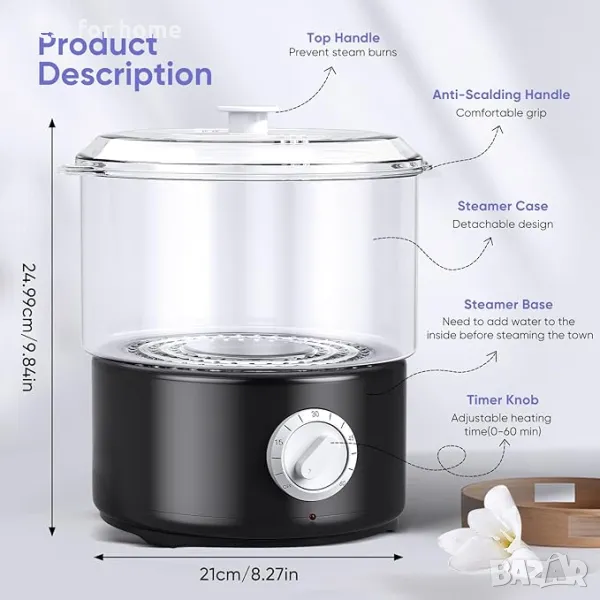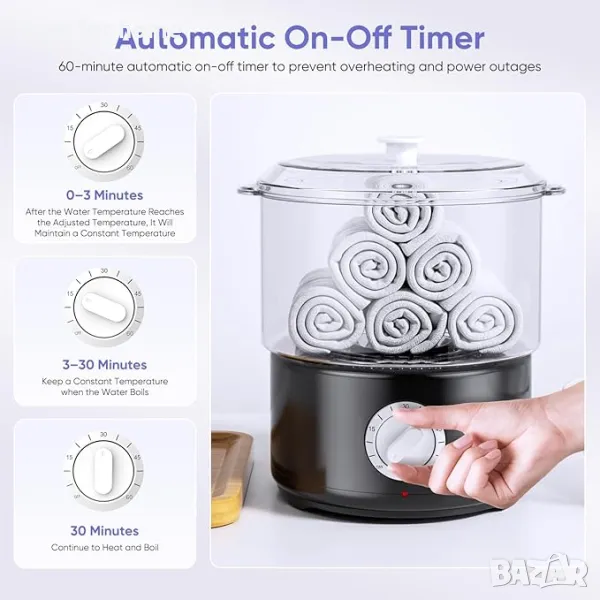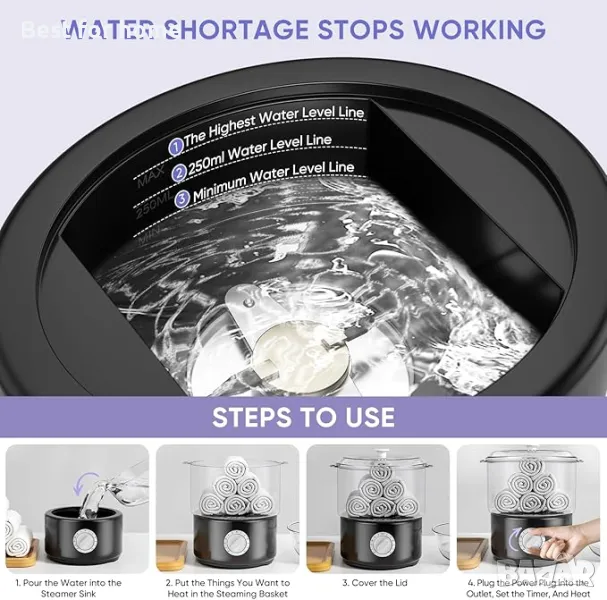 【Функция на таймера и безопасен дизайн】: Нагревателят за кърпи има функции за таймер и мелодия, така че е по-безгрижен за използване. Оборудван с функция таймер за предотвратяване на прегряване и спиране на захранването. Можете да зададете времето за задушаване предварително, за да предотвратите прегряване. За допълнителна защита, той автоматично ще се изключи, когато няма вода. (Ако работното време надвишава 1 час, моля, добавете вода навреме.)