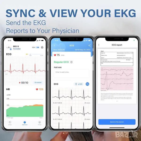 ЕКГ с AI анализ: Идентифициране на сърдечни проблеми чрез AI анализ, като аритмия, сърдечен арест, предсърдно мъждене (AF), тахикардия и брадикардия и преждевременни предсърдни контракции (PAC).