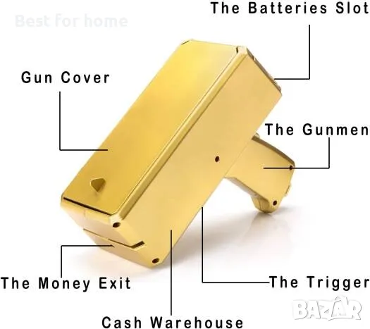 Amazing Money Shooter Този пистолет за пари е играчка, която може да захранва до над 100 броя доларови банкноти или подобни с бърза скорост. Изпратете пари, летящи през стаята и карайки парите да валят, без да докосвате банкнота.