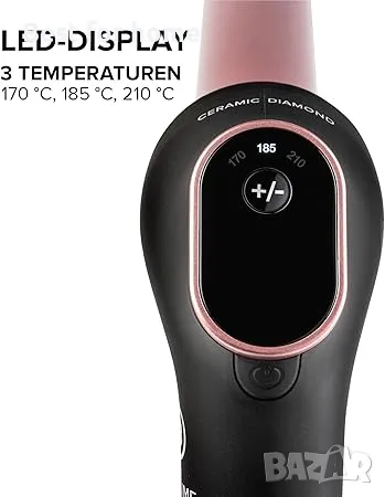 LED дисплей; 3 регулируеми температури в зависимост от типа коса: 170C, 185C, 210°C за желаното оформяне, като същевременно защитава косата Практична ръкавица: улеснява увиването на кичура