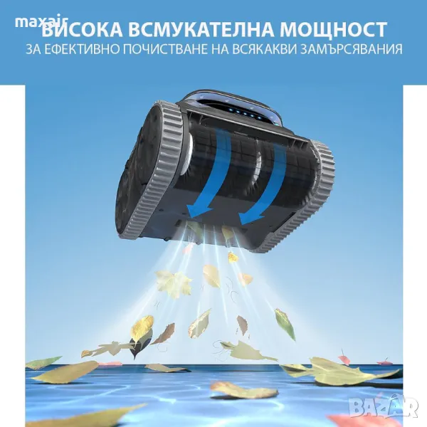 Акумулаторният робот Wybot S1 ефективно почиства дъното, стените и водната линия на Вашия басейн чрез две гъвкави четки, мощен троен мотор, специално проектирана система за задвижване на четирите колела и широк засмукващ отвор. По този начин той може ефективно да събира пясък, мръсотия, листа и други замърсявания от басейни, изработени от различни материали – плочки, мозайка, PVC и други.
