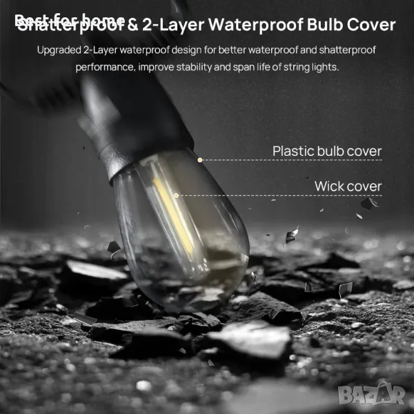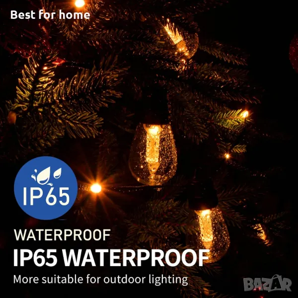 IP65 Водоустойчивост: Всяка крушка от веригата за външно осветление е изработена от 2 слоя висококачествен компютърен материал и е изградена с технология, устойчива на атмосферни влияния, достигайки ниво на водоустойчивост IP65.