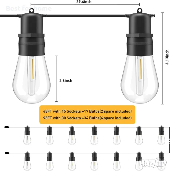 TCL LED външни светлини, 96FT патио светлини с S14 30+4 (резервни) пластмасови крушки, устойчиви на разрушаване, IP65 водоустойчиви, включени в списъка на ETL, за тежки условия на работа за осветление в задния двор, осветление за бистро, осветление за кафене.