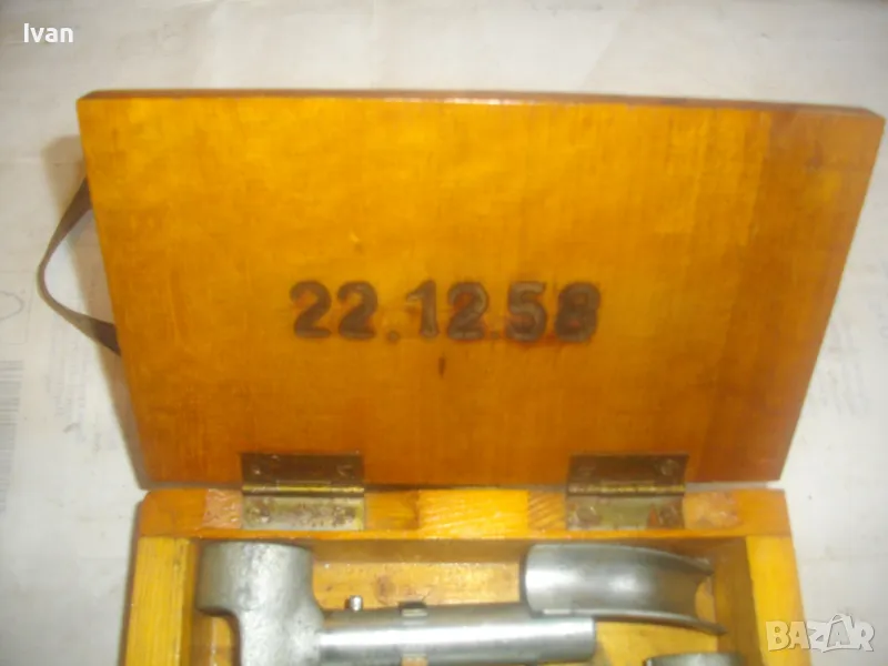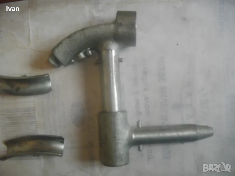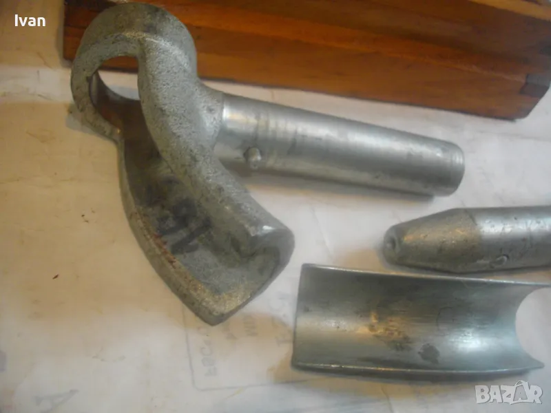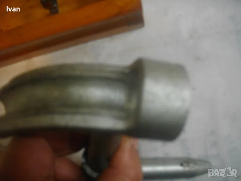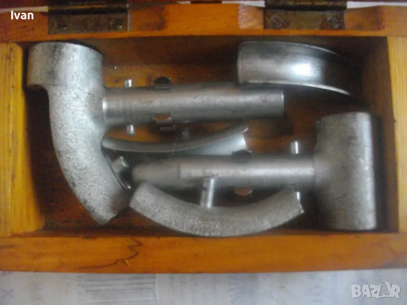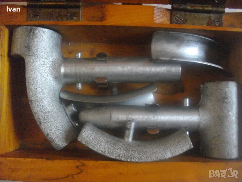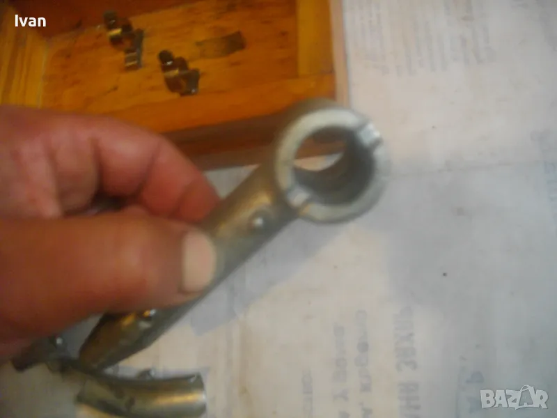 ОПИСАНИЕ на уред за раздуване на тръби - раздухвач на тръби в дървена кутия - цена 299 лв. Немски професионален от стария материал. Старо качество. Раздухване на тръби диаметър от ф 16 мм до ф 22 мм. Марка - EWZ. Почти нов, пълен комплект, в отлично визуално, работно и механично състояние. Размери на кутията - 205х120х65мм., пристягане чрез оригинална платова лента вързалка с метална закопчалка.Включва 5 части метални плюс кутията. Всчки части са стоманени. Раздухвач, стойка към раздухваза за различен размер полукръг за раздухване. 3 разли„ни по раземр полукръга, който се поставят на раздухвача - размери 16мм, 20 мм, 22 мм. Тегло на комплекта - 1,5 кг. Цена - 299 лв.