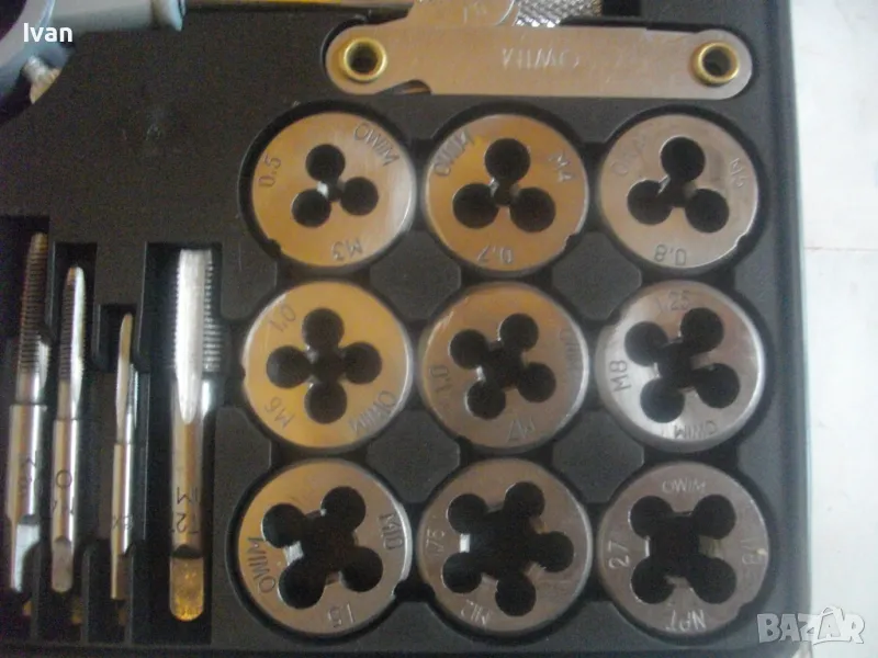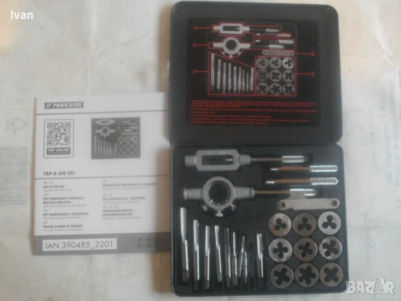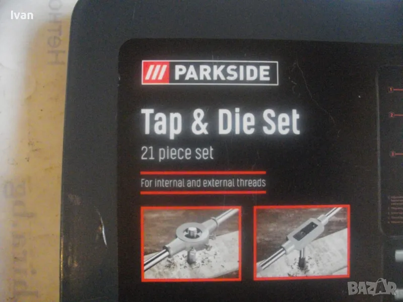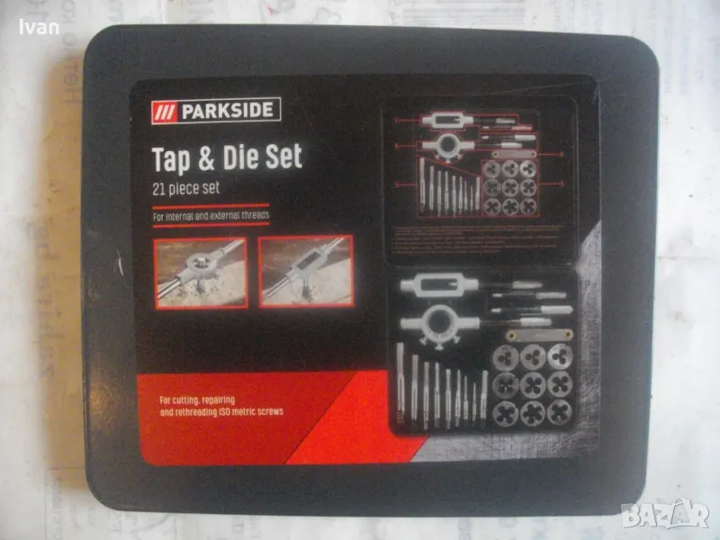 ОПИСАНИЕ на нов немски комплект за външни и вътрешни резби - цена 99 лв. Марка и модел Parkside. Съвсем нов, неизползван и неупотребяван. За резби от М 3 до М12. Общо 21 бр. метчици и