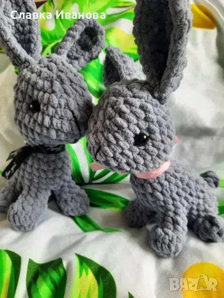 Плетено зайче на една кука в реалистична форма, високо около 25 см. Налични 2 броя в сив цвят. Цена за 1 бр. - 50лв., за 2 броя - 90лв.