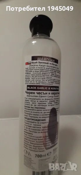 Турски шампоан с черен чесън и кератин против косопад - 700 мл. Шампоанът е подходящ за всички типове коса. Има описание относно шампоана на български език на гърба на опаковката.