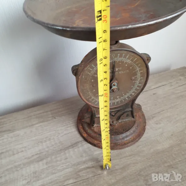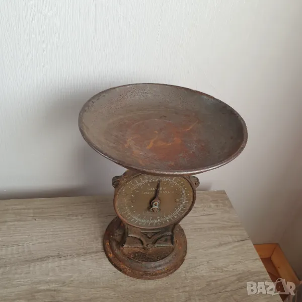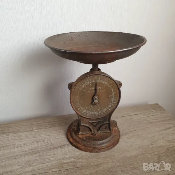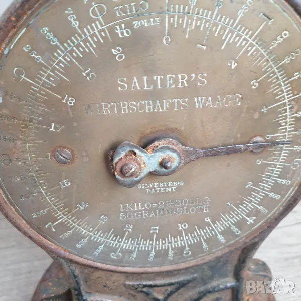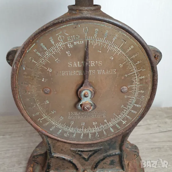 Везната работи точно и мери от 0 до 10 килограма.Тази ретро семейна везна Salters е истинско бижу за колекционери. Изработена от висококачествен лят метал с месингов циферблат, тази везна е здрав и надежден инструмент за ежедневна употреба. Везната се доставя с оригиналния си повдигащ се съд и е чудесно допълнение към всяка колекция.Изработена в Обединеното кралство около 1900година, тази везна е прекрасно произведение на ретро технология, която със сигурност ще впечатли всеки колекционер.