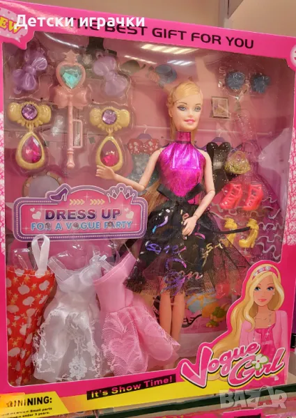 Детски комплект Кукла с атрактивна рокля, обувки, жезъл, обеци и аксесоари за коса и прически.