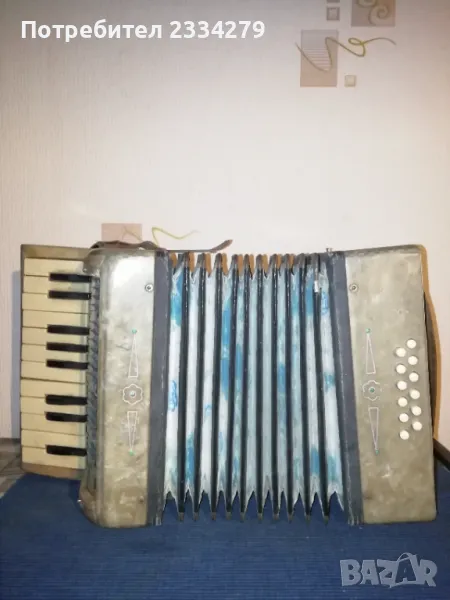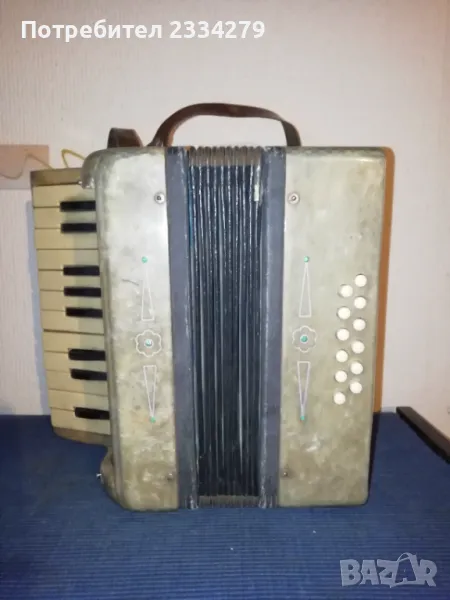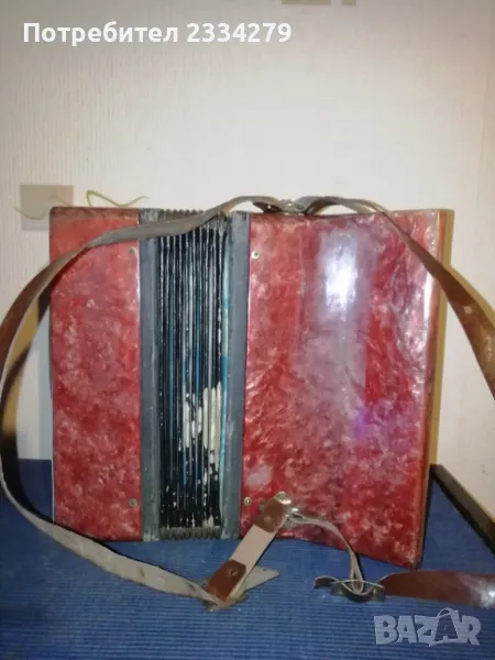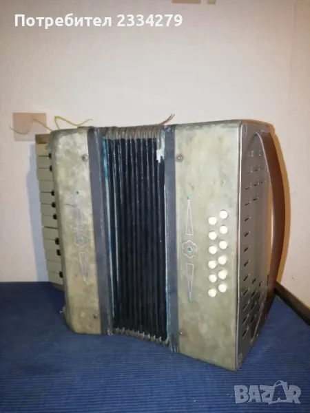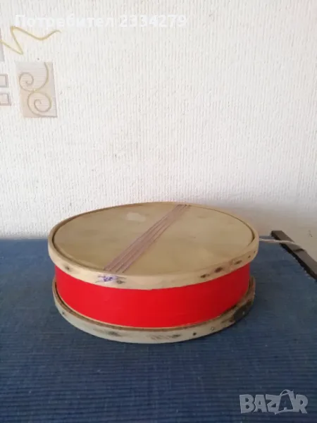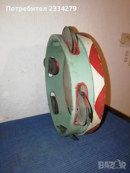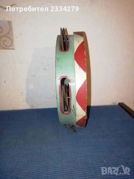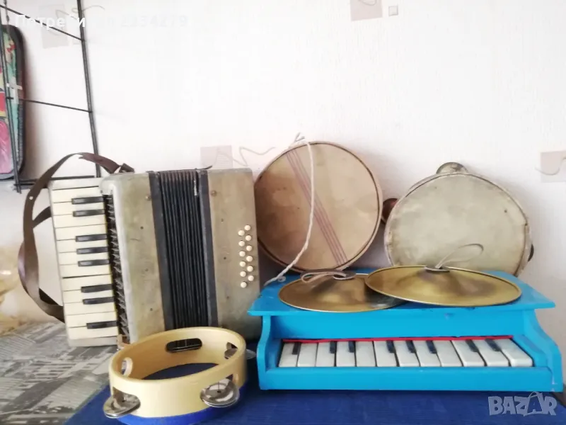 Стари децки музикални инструменти от 50-60 години. N:1(НЕВАЛИДНА); N:2 малък децки акордеон от баса, свирещ, цена 18€.; N:3 ударен музикален децки инструмент ,,дайре" ръчно рисувано изработено от дърво, кожа, ламарина, размери 21х5см.,цена 5€.; N:4 старо децко барабанче 40-50години,ръчно изработено от кожа и дърво размери: 20х7см., цена 8€.; N;5 старо децко
