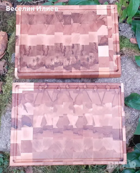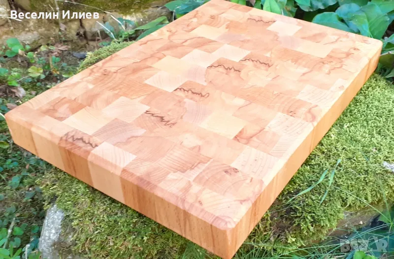 Дъските са изработени от БУК.Импрегнирани с ленено масло и натурална вакса от карнауба.Дъски End grain с размери 25х35х3, 5см.цена-40лв.Материял:БукНе се криви – при правилна употреба и поддръжка този вид дъски остават идеално равна и плоски, защото напрежението породено от промяна на влажността в дъската се възпира от съседните блокчета дърво, които се пазят взаимно.Не затъпяват ножа толкова бързо, колкото другите видове дъски – режещият ръб се плъзга между дървесните влатна.Почти не се драска и се самолекува от драскотини – при натиска упражнен от ножа дървесните влатна (които са като микро четка) се отместват на страни и по-малко се нараняват.Износоустойчивоста е много по-голяма в сравнение с другите видове дървени дъски. Поддръжка и начин на употреба: Ако искате Енд Грейн дъската Ви да остане като нова дълги години, трябва да се имат в предвид слените неща. Никоя дървена дъска не е подходяща за миене в миялна машина, импрегнирайте я 1-2 пъти в месеца или повече поне в началото на употребата. Добри варианти са течният парафин за пиене тунговото масло и лененото масло (всички растителни масла, олио зехтин не са особено препоръчителни, поради свойството им да гренясват с времето което може да доведе до слабо осезаема миризма на дъската). След употреба дъската може да се измие с течен сапун, гъба и вода на место и да се забърше с кърпа за да не остава мокра(избягвайте да я миете на чешмата и да я обливате обилно дълго време, защото този вид дъски са по-чувствителни на мокрене).