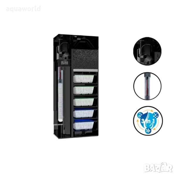 Аквариумът е изработен от материали с отлично качество и алуминиеви рамки. Капакът позволява пълен достъп до аквариума, улеснявайки неговото поддържане.