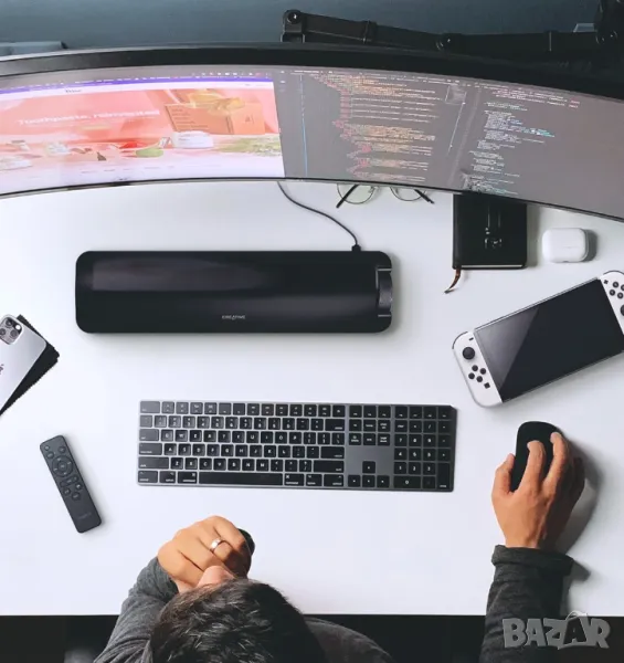 • Мощен звук с вграден бас – 2.0 конфигурация с двойни широколентови "racetrack" говорители и пасивен радиатор за дълбок бас без необходимост от субуфер. Пикова мощност до 48W.
