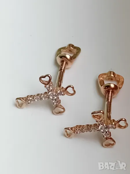 Много нежни и красиви, кръст със сърца.От розово злато 585 с тегло 0,9 грама.Закопчаване с резба много здраво.Точно 1 см. са.Крайна цена.
