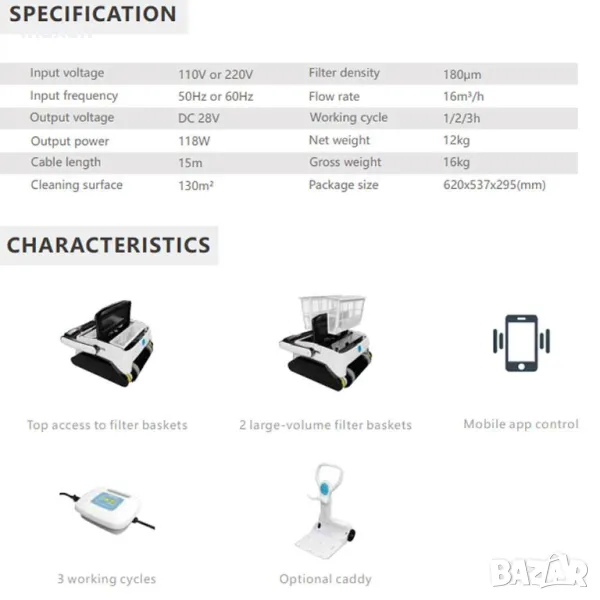 * Използването на робот за почистване на басейни не отменя нуждата от използване на специализирани препарати за поддръжка на качеството на водата!