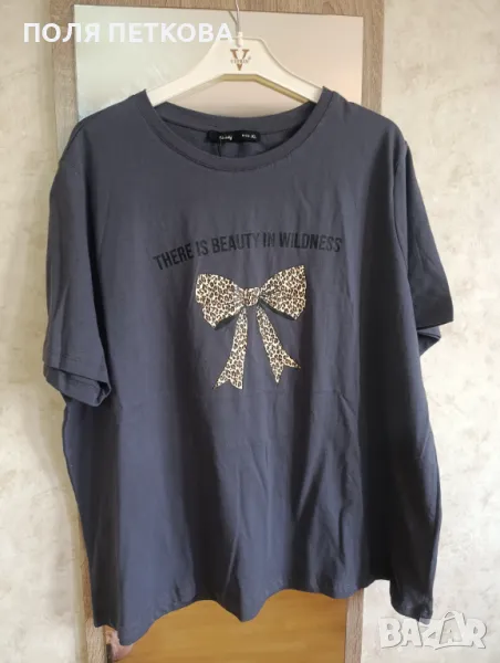 Нова тениска в тъмносив цвят с панделка в тигров принт размер XL памук с еластан гръдна 120 дължина 65 см