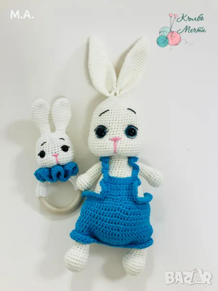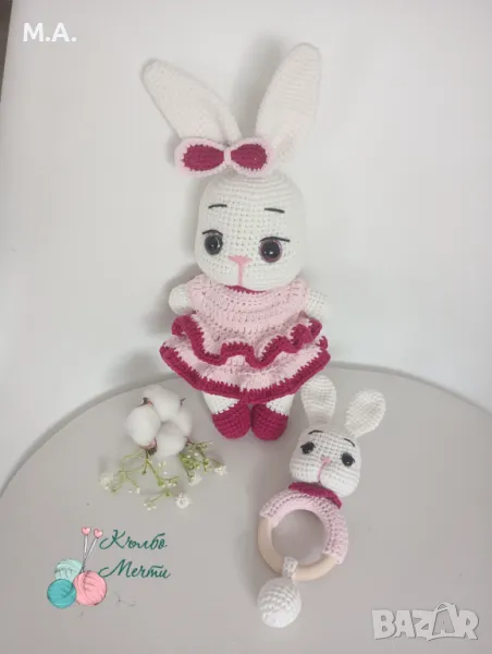 Тези прекрасни зайчета, които могат да бъдат и в комплект с дрънкалка са изплетени от прежда подходяща за бебета и малки деца, с обезопасени очички и пълнеж от силиконов гранулиран пух.