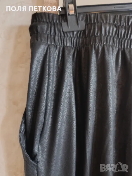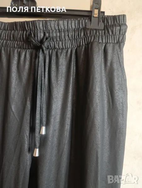 Черно долнище имитация на кожа изключително тънка и еластична материя много леко и удобно талия на ластик от 90 с еластичност до 130 ханш от 130 са с еластичност до 150 дори до 160 см цяла дължина 108 см ново