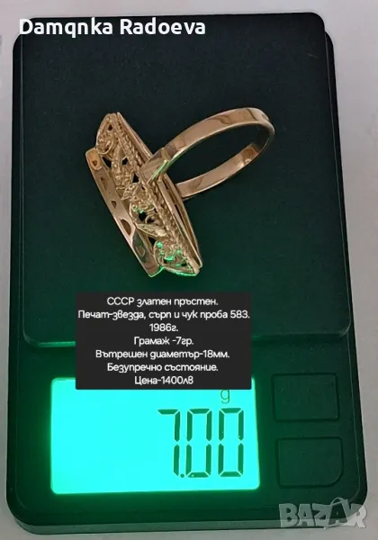 СССР златен пръстен. Печат-звезда, сърп и чук проба 583.1986г.Грамаж -7гр.Вътрешен диаметър-18мм. Безупречно състояние. Цена-895 €