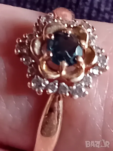 Руски златен пръстен с естествен топаз и фианити с форма на цвете → Обява 49784159