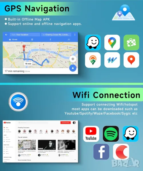 Поддържа всички навигации, съвместими с Android: IGO, WAZE, GOOGLE Maps и други