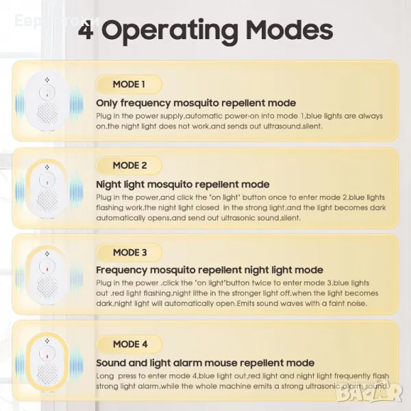 Този плъгин против мишки има 4 уникални режима на използване. За да промените режимите, натиснете веднъж бутона ВКЛ./ИЗКЛ. Бутонът за превключване ще мига с различни цветове за всеки режим. Мощните ултразвукови вълни стимулират нервната и слуховата система на гризачите, прогонвайки ги от дома ви. Вашият дом ще бъде свободен от гризачи след 4-5 седмици. За зони със сериозно нашествие от гризачи са необходими 2 или повече допълнителни ултразвукови репелента за гризачи.