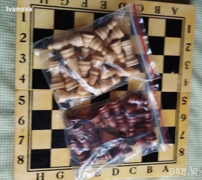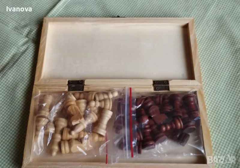 Дебелина на кутията 2.5 см. Размер на пешката:2.5см., на коня:3см. и на царя:4.5см.