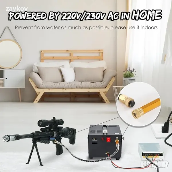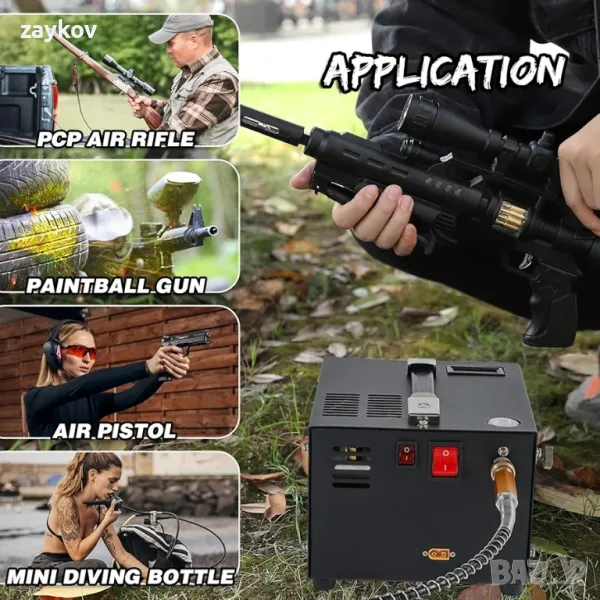 въздушни пушки, топки за боядисване. Може да се използва и за пожарогасене, откриване на течове, тестване под налягане, автомобилостроене и др. Ако искате да използвате устройството за пълнене на бутилки за гмуркане, трябва да го оборудвате с голям филтър (уредът не се доставя с него).