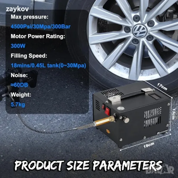 Малък размер, висока производителност: Този тип въздушен компресор е лек, малък, лесен за пренасяне, работно налягане 300 bar / 4500 psi / 30 MPa, поток на отработените газове не по-голям от 20 l/min и 12 V DC.