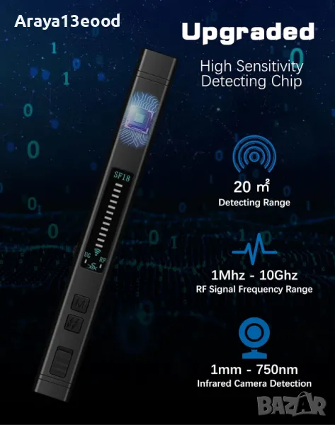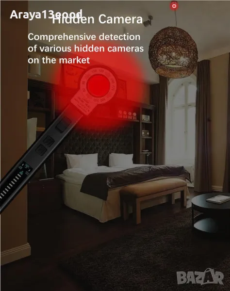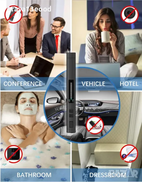 Широк обхват на откриване: Засича скрити камери, WiFi камери, GSM подслушватели, GPS локатори и RF тракери.