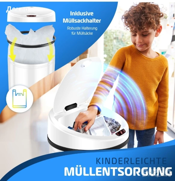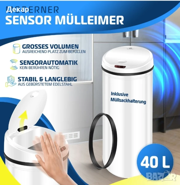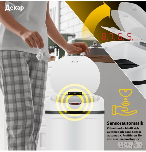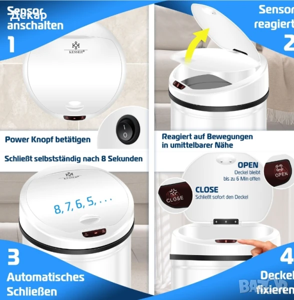 Описание на продуктаАвтоматично сензорно кошче за боклук KESSER, автоматично отваряне и затваряне благодарение на оборудвана сензорна технология, включително затягащ пръстен за торби за боклук и LED дисплей с функции.Двете ръце са пълни с боклук и няма свободна ръка да отвори кофата за боклук ? Няма проблем, нашият кош за боклук се отваря веднага щом се приближите и можете да изхвърлите боклука си без никакви проблеми . В замяна на това кофата за боклук отново се затваря сама благодарение на висококачествената сензорна технология . Въпреки това, ако искате да отворите кофата за боклук ръчно , това не е пречка , с бутон ON / OFF можете да изключите автоматичната сензорна система само с натискане на бутон . Кошът за отпадъци е изработен от полирана стомана и поради това е особено здрав и издръжлив . Обхватът на доставката включва затягащ пръстен за подходящи торби за боклук . Нашият контейнер за боклук се захранва от 4x DC 1.5V D батерии. Акценти на продукта: Автоматично отваряне при приближаване • Автоматично затваряне • Оборудван със сензорна технология • Включен затягащ пръстен за торби за боклук • Бутон ON/OFF за изключване на сензорната технология • LED функционален дисплей • Контейнер от полирана неръждаема стомана • Подвижен капак • Захранва се с батерии 4x DC 1.5V D (не са включени)Технически подробности :• Височина на продукта: затворен прибл. 77 см, с отворен капак прибл. 90 см• Диаметър: прибл. 36 см• Капацитет: прибл. 56л• Капак: пластмаса• Корпус: неръждаема стомана• Вкл. пластмасов вътрешен ринг за закачане на торба за боклук• Тегло: 3.4кг