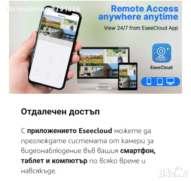 С приложението Eseecloud можете да преглеждате системата от камери за видеонаблюдение във вашия смартфон, таблет и компютър по всяко време и навсякъде.
