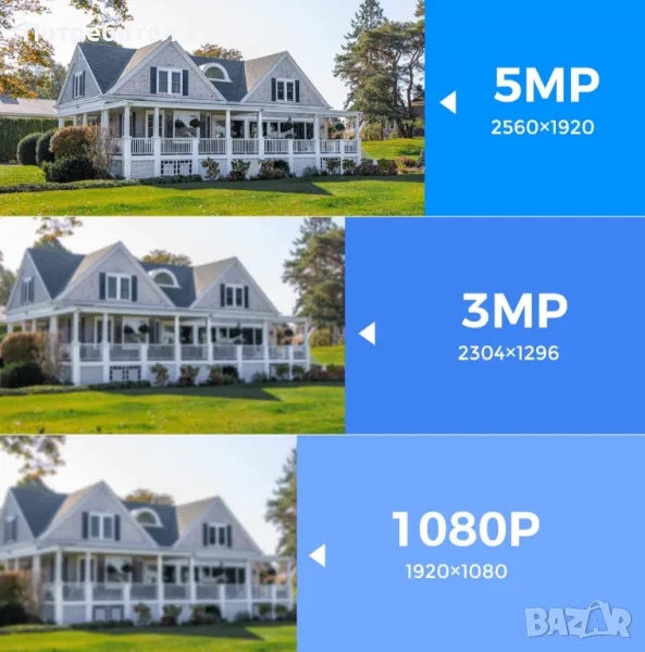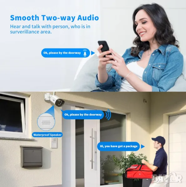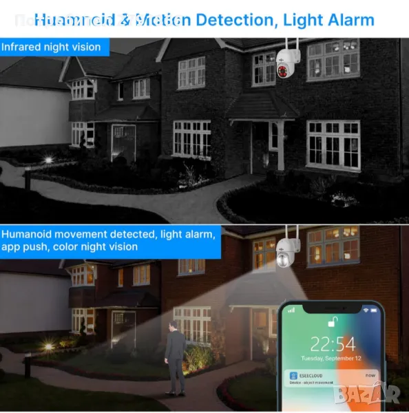 Аларма със сирена, нощно виждане, устойчива на атмосферни влияния, двупосочно аудио, разпознаване на хора