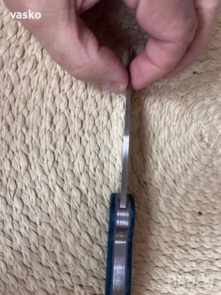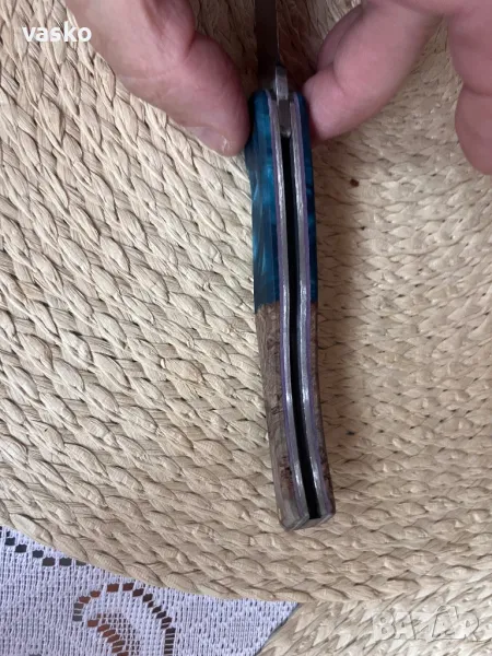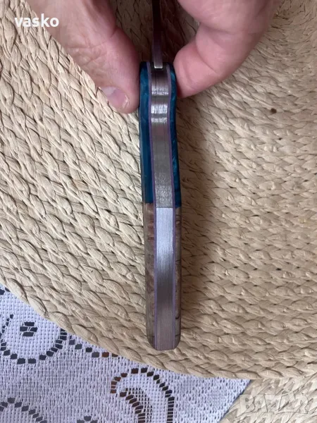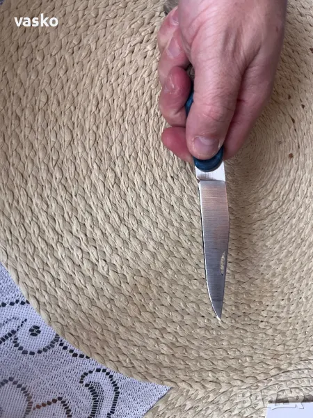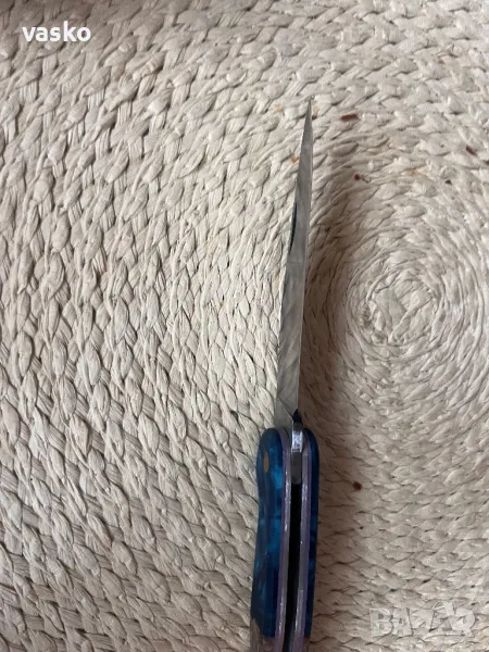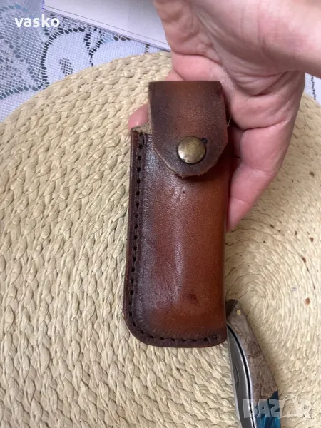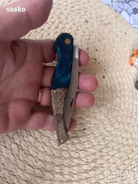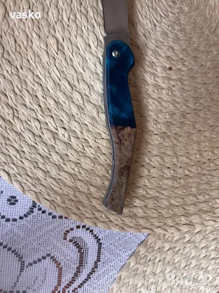Ножче ръчна изработка,стомана 1.4116,закален на 58 еденици,обща дължина 22,3см,острие 9,2см,ширина 2см,дебелина 3мм,дръжка он стабилизирана дървесина хибрид,калъфче от естествена кожа за носене на колан.Всичко е ръчна изработка.Ново,перфектно.