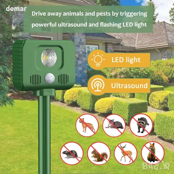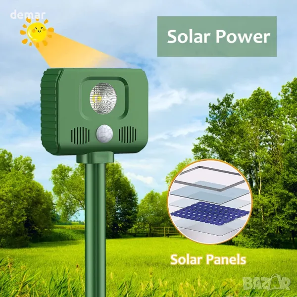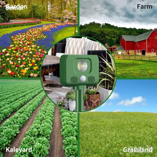 Захранван със слънчева енергия уред за прогонване на животни, предназначен да държи нежеланите животни далеч от вашия дом и градина. С 5 режима на отблъскване и 5 размера на звуковата вълна, той ефективно възпира различни животни, без да ги наранява. Устройството разполага с усъвършенствана ултразвукова технология и вграден сензор за откриване на движение за оптимална работа. Опциите за соларно и USB зареждане гарантират непрекъсната работа, докато водоустойчивият рейтинг IPX4 позволява универсална употреба на открито. Лесният за използване и хуманизираният дизайн го правят безопасен както за животни, така и за хора. Перфектен за вътрешни дворове, градини, ферми и други, този репелер предлага ефективна защита срещу вредители. Пакетът включва репелента, монтажни ленти, USB кабел за зареждане и ръководство за потребителя за удобна настройка и работа. Кажете сбогом на неканените гости с този ефикасен и универсален уред за прогонване на животни.