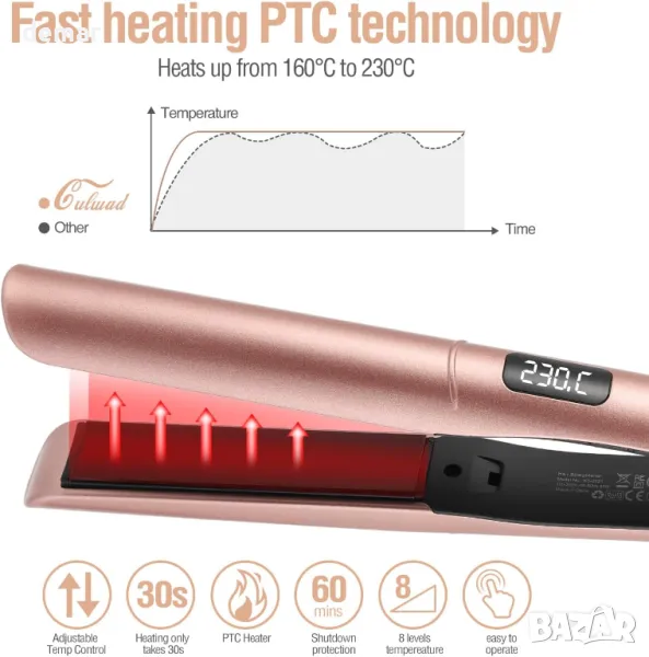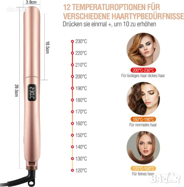 Тази професионална преса за коса, предназначена за средна до дълга коса, разполага с 1-инчови тънки пластини за ефективно изправяне и къдрене. С LCD дисплей и PTC технология за отопление, той загрява до 100 ℃ само за 30 секунди и предлага регулируеми температури от 100 ℃ до 220 ℃ в 12 настройки, за да отговарят на различни типове коса. Черните керамични турмалинови плочи излъчват отрицателни йони, намалявайки къдренето чрез запечатване на кутикулите на косъма и запазване на естествената влага, минимизирайки увреждането от топлина. Идеален за пътуване, той идва с двойно напрежение (110-240V) и предпазна ключалка за лесно опаковане и използване по целия свят. Освен това има функция за автоматично изключване за 60 минути за безопасност. Този универсален инструмент, идеален за различни поводи, е отличен подарък за любими хора.